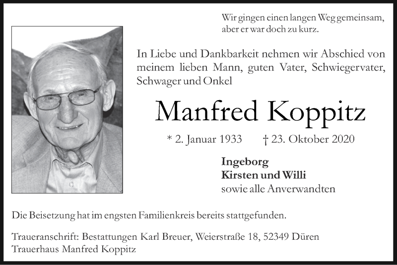 Hier finden Sie alle Traueranzeigen aus der Zeitung, die bisher für Manfred Koppitz erschienen sind. Weitere Traueranzeigen, die in der Zeitung erscheinen, werden hier ebenfalls aufgelistet