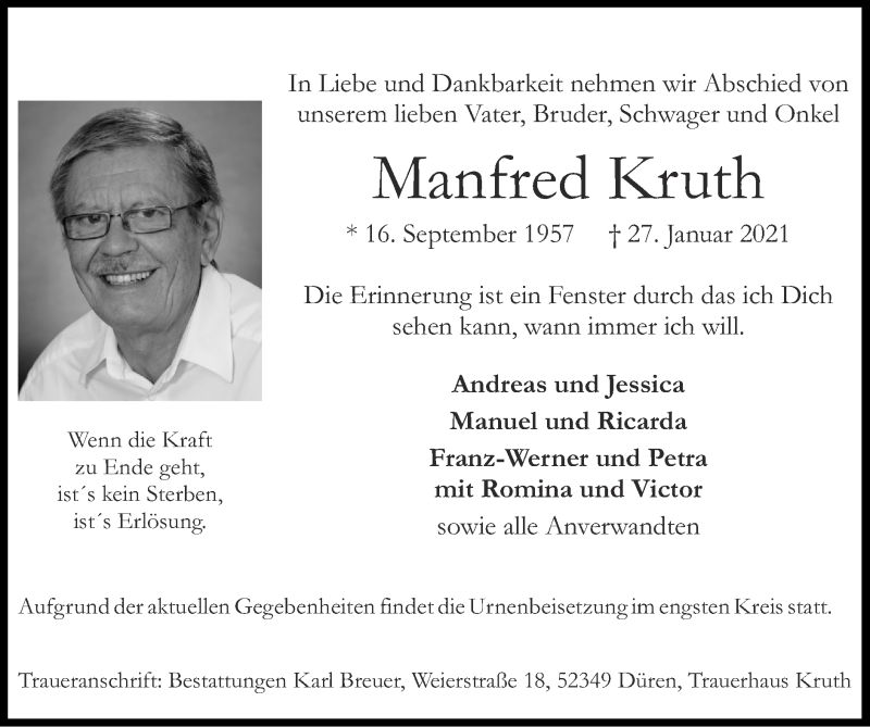Hier finden Sie alle Traueranzeigen aus der Zeitung, die bisher für Manfred Kruth erschienen sind. Weitere Traueranzeigen, die in der Zeitung erscheinen, werden hier ebenfalls aufgelistet