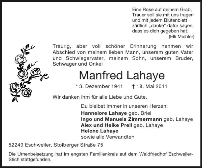 Hier finden Sie alle Traueranzeigen aus der Zeitung, die bisher für Manfred Lahaye erschienen sind. Weitere Traueranzeigen, die in der Zeitung erscheinen, werden hier ebenfalls aufgelistet