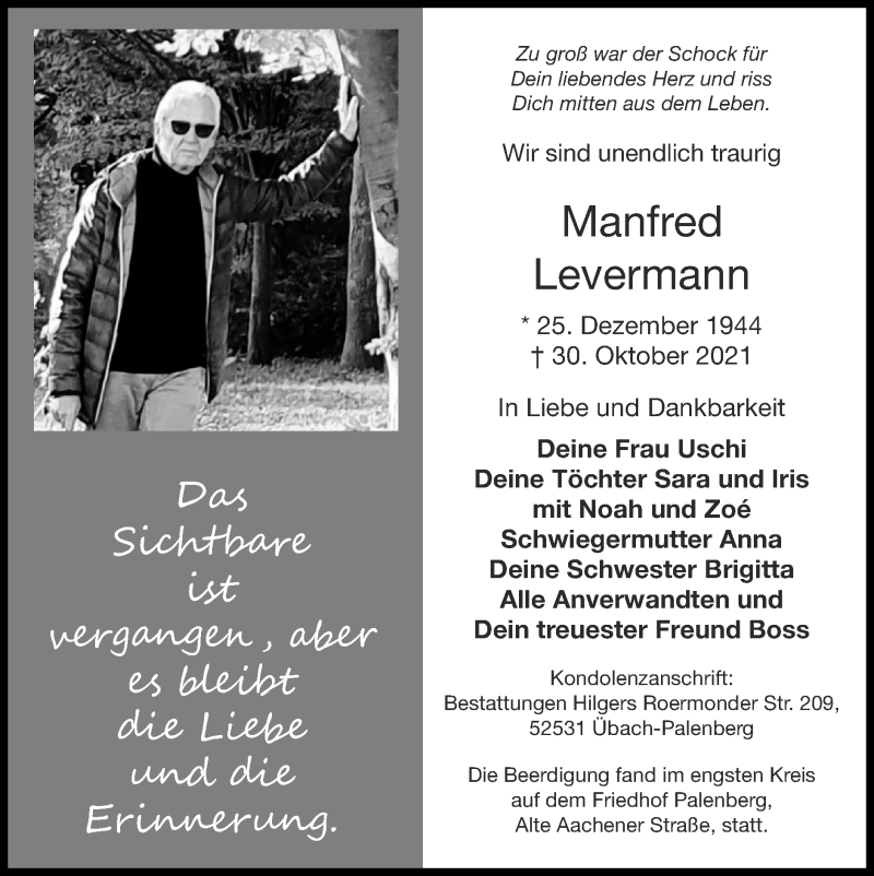 Hier finden Sie alle Traueranzeigen aus der Zeitung, die bisher für Manfred Levermann erschienen sind. Weitere Traueranzeigen, die in der Zeitung erscheinen, werden hier ebenfalls aufgelistet