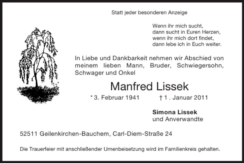 Hier finden Sie alle Traueranzeigen aus der Zeitung, die bisher für Manfred Lissek erschienen sind. Weitere Traueranzeigen, die in der Zeitung erscheinen, werden hier ebenfalls aufgelistet