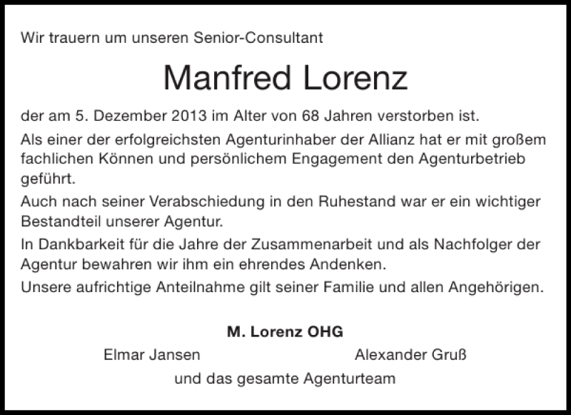 Hier finden Sie alle Traueranzeigen aus der Zeitung, die bisher für Manfred Lorenz erschienen sind. Weitere Traueranzeigen, die in der Zeitung erscheinen, werden hier ebenfalls aufgelistet