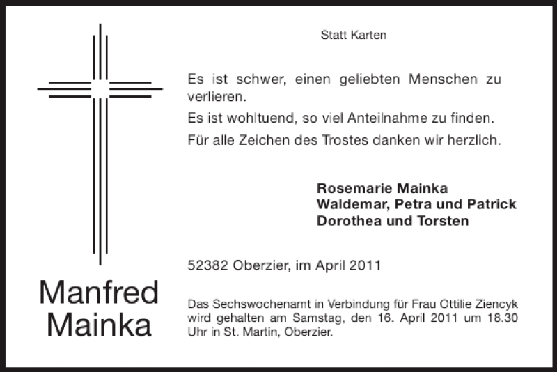 Hier finden Sie alle Traueranzeigen aus der Zeitung, die bisher für Manfred Mainka erschienen sind. Weitere Traueranzeigen, die in der Zeitung erscheinen, werden hier ebenfalls aufgelistet