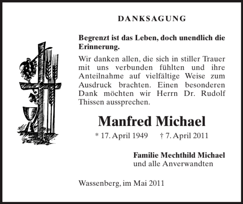 Hier finden Sie alle Traueranzeigen aus der Zeitung, die bisher für Manfred Michael erschienen sind. Weitere Traueranzeigen, die in der Zeitung erscheinen, werden hier ebenfalls aufgelistet
