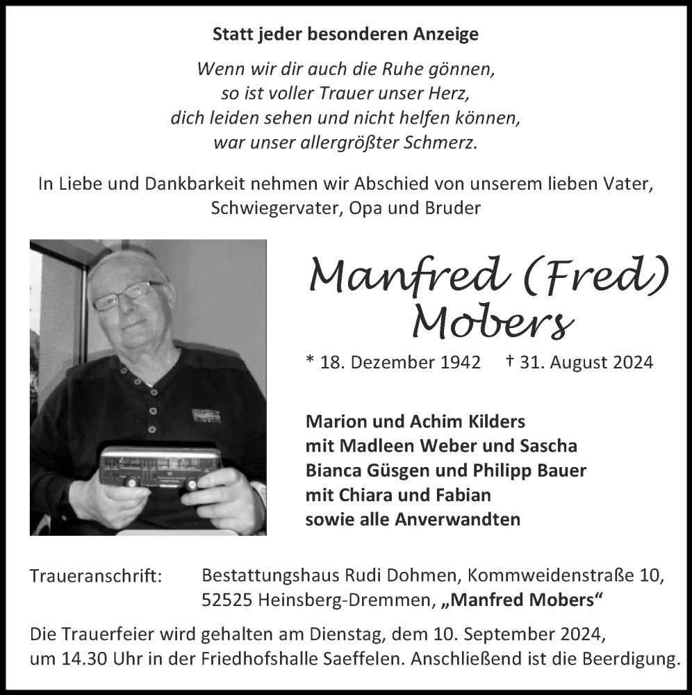 Hier finden Sie alle Traueranzeigen aus der Zeitung, die bisher für Manfred Mobers erschienen sind. Weitere Traueranzeigen, die in der Zeitung erscheinen, werden hier ebenfalls aufgelistet