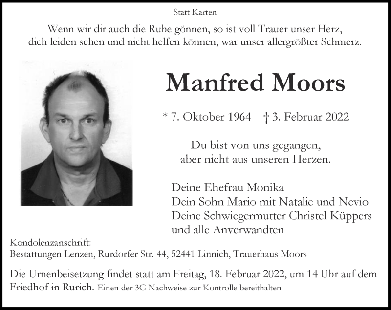 Hier finden Sie alle Traueranzeigen aus der Zeitung, die bisher für Manfred Moors erschienen sind. Weitere Traueranzeigen, die in der Zeitung erscheinen, werden hier ebenfalls aufgelistet