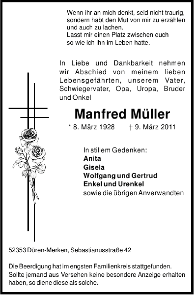 Hier finden Sie alle Traueranzeigen aus der Zeitung, die bisher für Manfred Müller erschienen sind. Weitere Traueranzeigen, die in der Zeitung erscheinen, werden hier ebenfalls aufgelistet