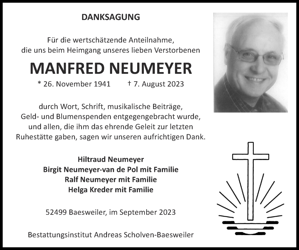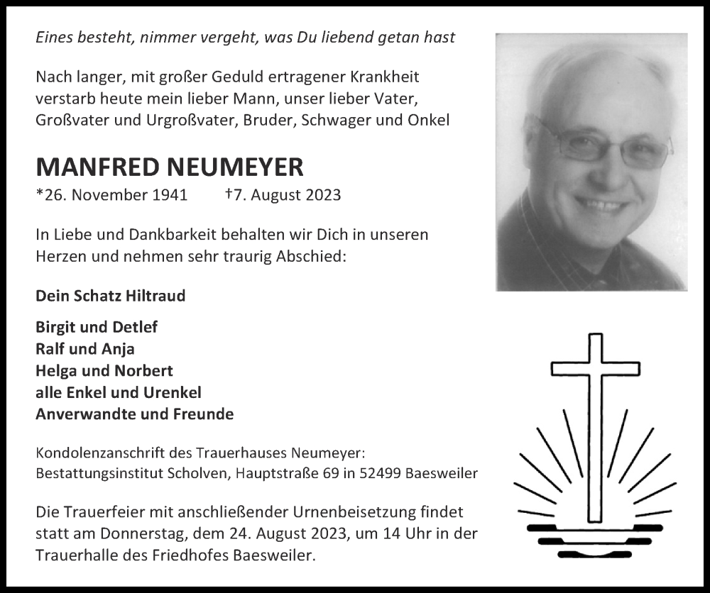 Hier finden Sie alle Traueranzeigen aus der Zeitung, die bisher für Manfred Neumeyer erschienen sind. Weitere Traueranzeigen, die in der Zeitung erscheinen, werden hier ebenfalls aufgelistet