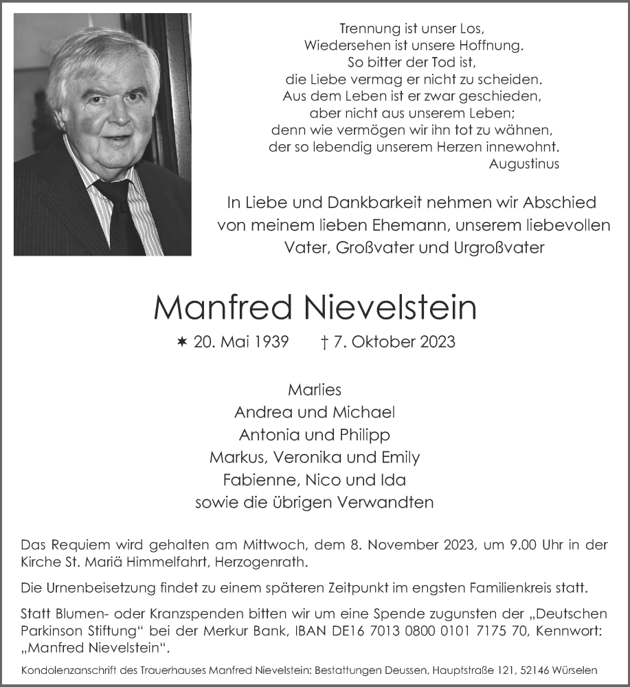 Hier finden Sie alle Traueranzeigen aus der Zeitung, die bisher für Manfred Nievelstein erschienen sind. Weitere Traueranzeigen, die in der Zeitung erscheinen, werden hier ebenfalls aufgelistet