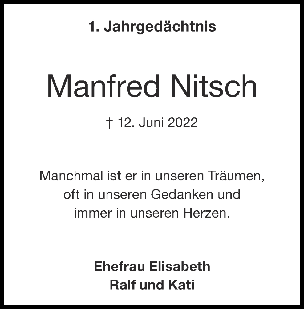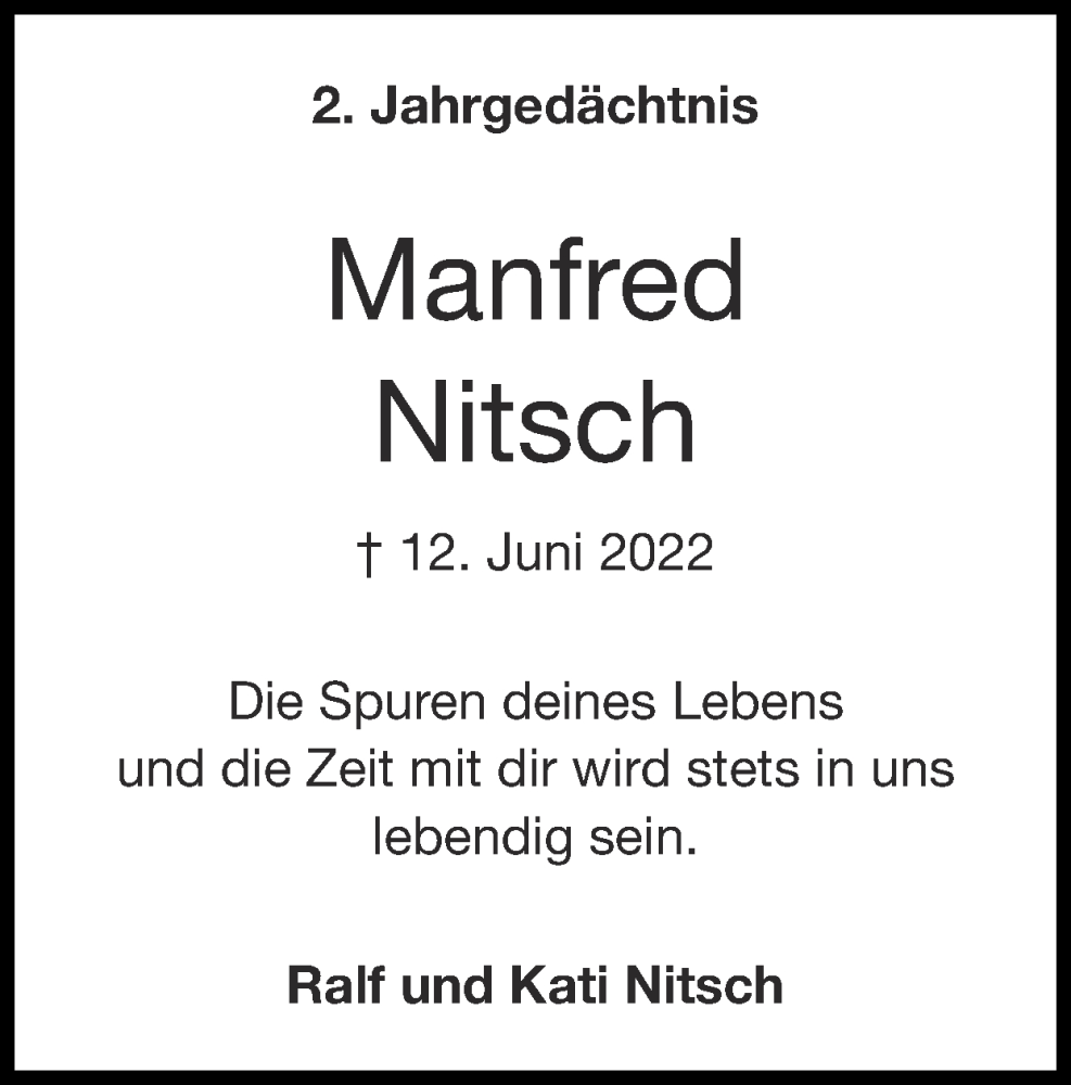 Hier finden Sie alle Traueranzeigen aus der Zeitung, die bisher für Manfred Nitsch erschienen sind. Weitere Traueranzeigen, die in der Zeitung erscheinen, werden hier ebenfalls aufgelistet