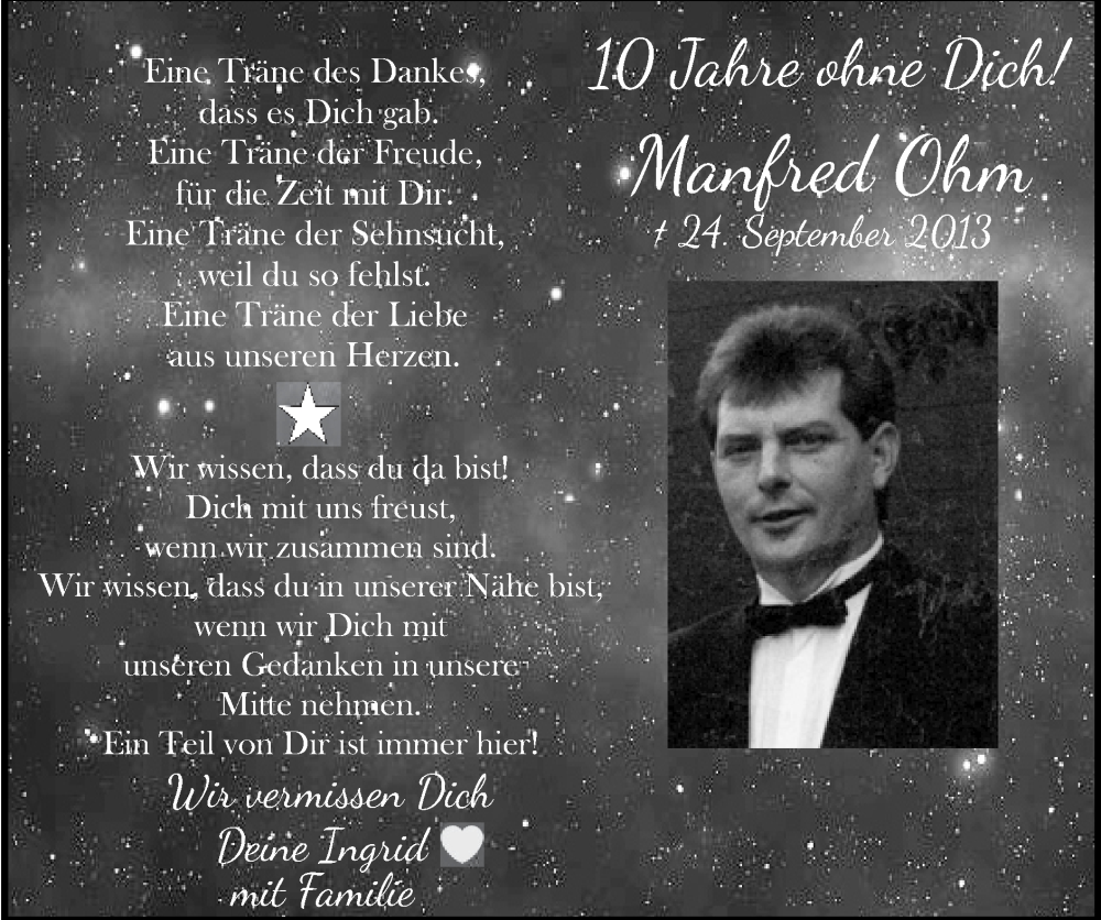Hier finden Sie alle Traueranzeigen aus der Zeitung, die bisher für Manfred Ohm erschienen sind. Weitere Traueranzeigen, die in der Zeitung erscheinen, werden hier ebenfalls aufgelistet