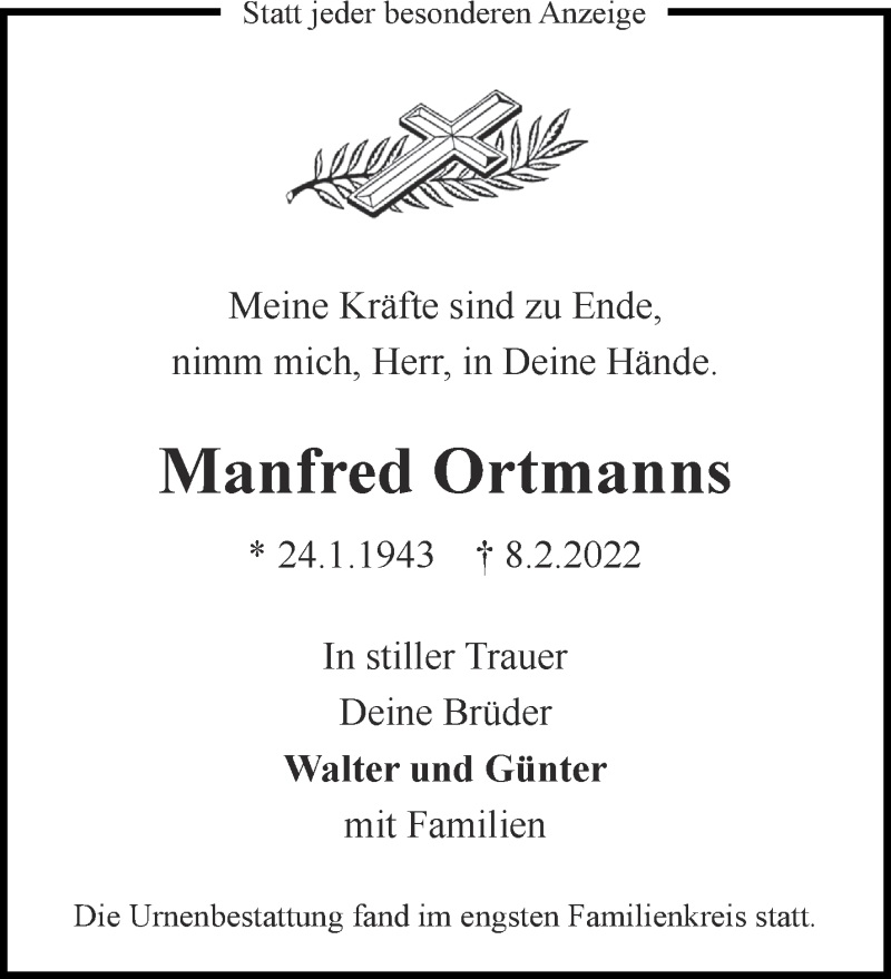 Hier finden Sie alle Traueranzeigen aus der Zeitung, die bisher für Manfred Ortmanns erschienen sind. Weitere Traueranzeigen, die in der Zeitung erscheinen, werden hier ebenfalls aufgelistet