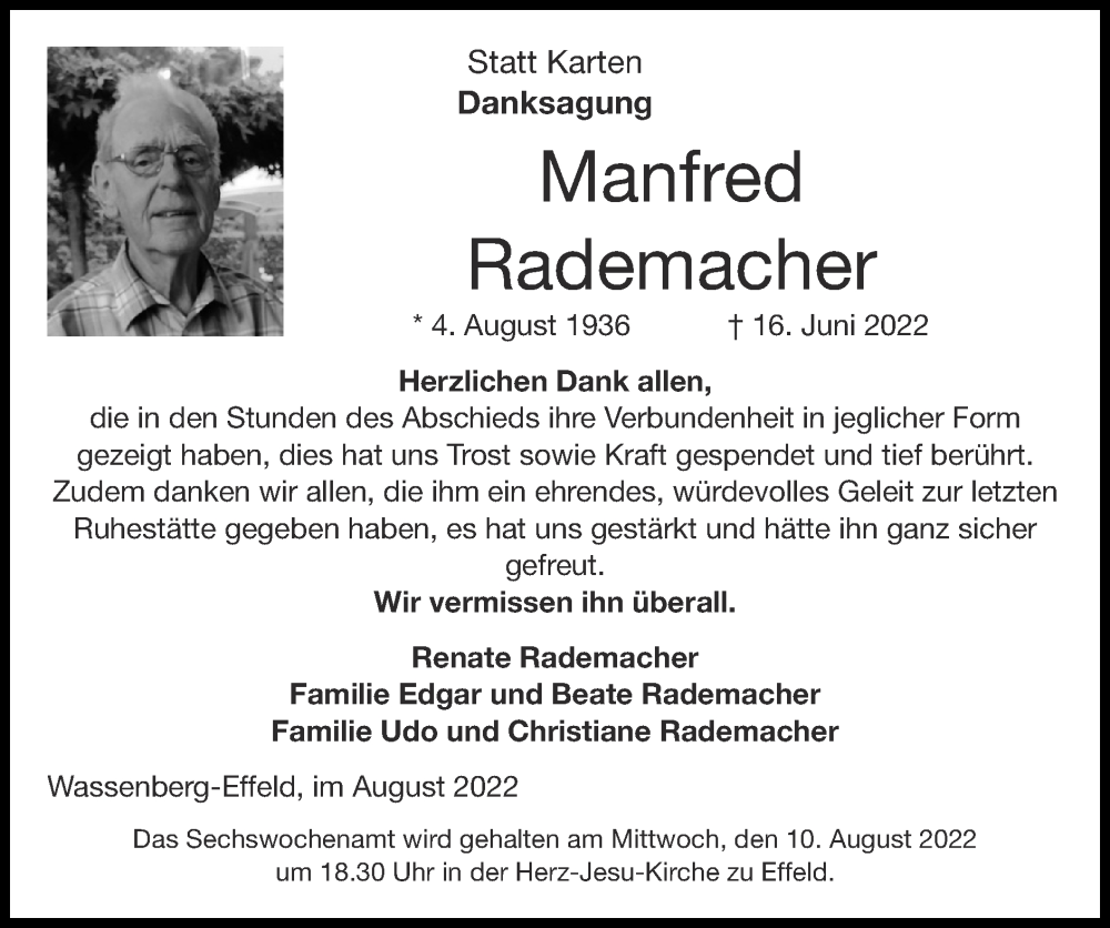 Hier finden Sie alle Traueranzeigen aus der Zeitung, die bisher für Manfred Rademacher erschienen sind. Weitere Traueranzeigen, die in der Zeitung erscheinen, werden hier ebenfalls aufgelistet