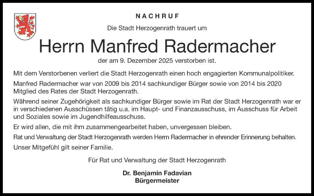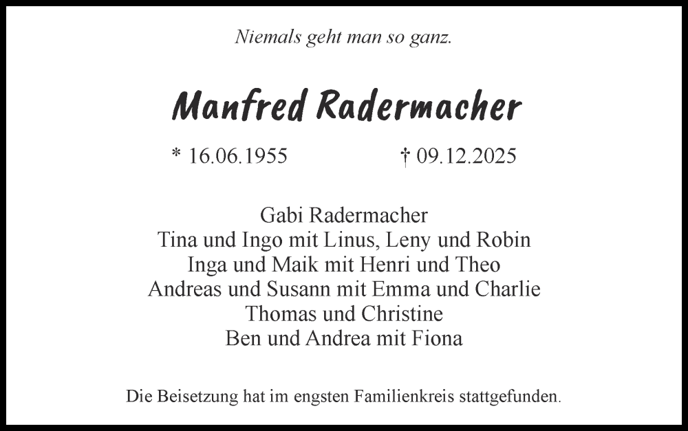 Hier finden Sie alle Traueranzeigen aus der Zeitung, die bisher für Manfred Radermacher erschienen sind. Weitere Traueranzeigen, die in der Zeitung erscheinen, werden hier ebenfalls aufgelistet