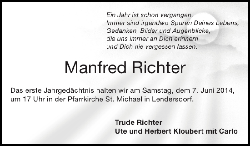 Hier finden Sie alle Traueranzeigen aus der Zeitung, die bisher für Manfred Richter erschienen sind. Weitere Traueranzeigen, die in der Zeitung erscheinen, werden hier ebenfalls aufgelistet