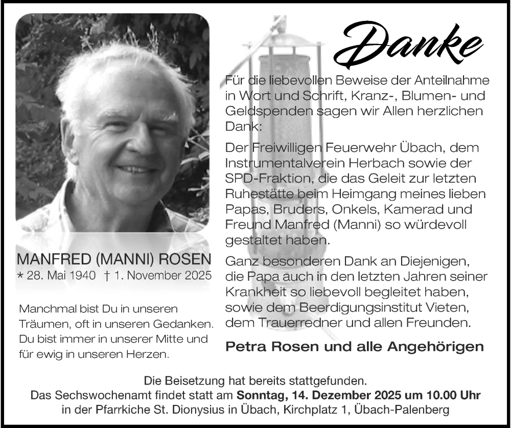 Hier finden Sie alle Traueranzeigen aus der Zeitung, die bisher für Manfred Rosen erschienen sind. Weitere Traueranzeigen, die in der Zeitung erscheinen, werden hier ebenfalls aufgelistet