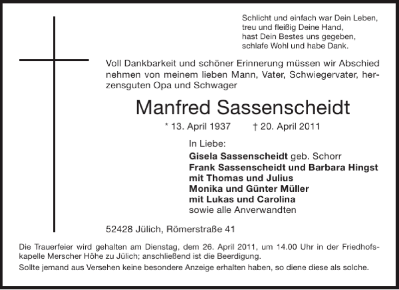 Hier finden Sie alle Traueranzeigen aus der Zeitung, die bisher für Manfred Sassenscheidt erschienen sind. Weitere Traueranzeigen, die in der Zeitung erscheinen, werden hier ebenfalls aufgelistet