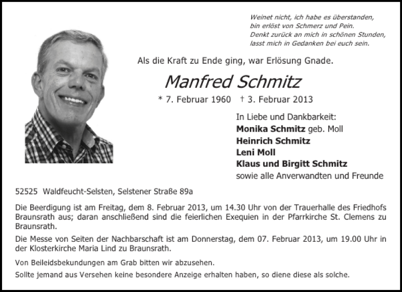 Hier finden Sie alle Traueranzeigen aus der Zeitung, die bisher für Manfred Schmitz erschienen sind. Weitere Traueranzeigen, die in der Zeitung erscheinen, werden hier ebenfalls aufgelistet