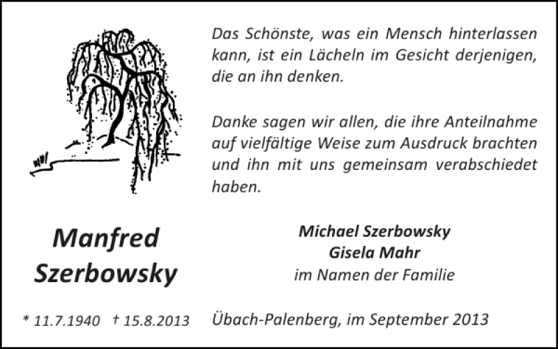 Hier finden Sie alle Traueranzeigen aus der Zeitung, die bisher für Manfred Szerbowsky erschienen sind. Weitere Traueranzeigen, die in der Zeitung erscheinen, werden hier ebenfalls aufgelistet