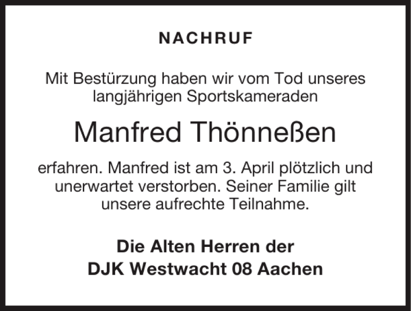 Hier finden Sie alle Traueranzeigen aus der Zeitung, die bisher für Manfred Thönneßen erschienen sind. Weitere Traueranzeigen, die in der Zeitung erscheinen, werden hier ebenfalls aufgelistet