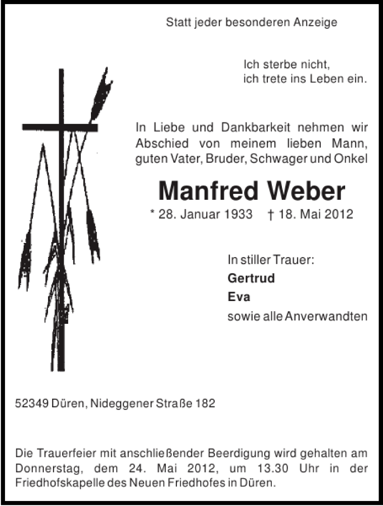 Hier finden Sie alle Traueranzeigen aus der Zeitung, die bisher für Manfred Weber erschienen sind. Weitere Traueranzeigen, die in der Zeitung erscheinen, werden hier ebenfalls aufgelistet