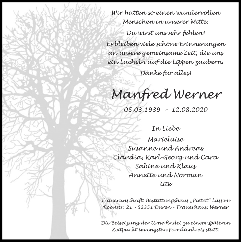 Hier finden Sie alle Traueranzeigen aus der Zeitung, die bisher für Manfred Werner erschienen sind. Weitere Traueranzeigen, die in der Zeitung erscheinen, werden hier ebenfalls aufgelistet