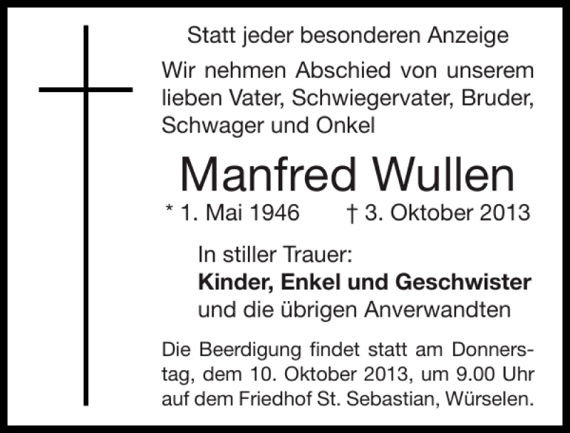 Hier finden Sie alle Traueranzeigen aus der Zeitung, die bisher für Manfred Wullen erschienen sind. Weitere Traueranzeigen, die in der Zeitung erscheinen, werden hier ebenfalls aufgelistet
