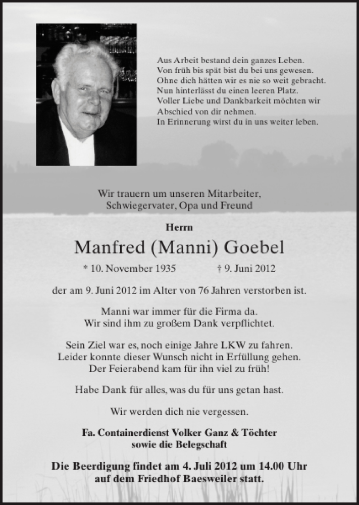 Hier finden Sie alle Traueranzeigen aus der Zeitung, die bisher für Manfred Manni Goebel erschienen sind. Weitere Traueranzeigen, die in der Zeitung erscheinen, werden hier ebenfalls aufgelistet