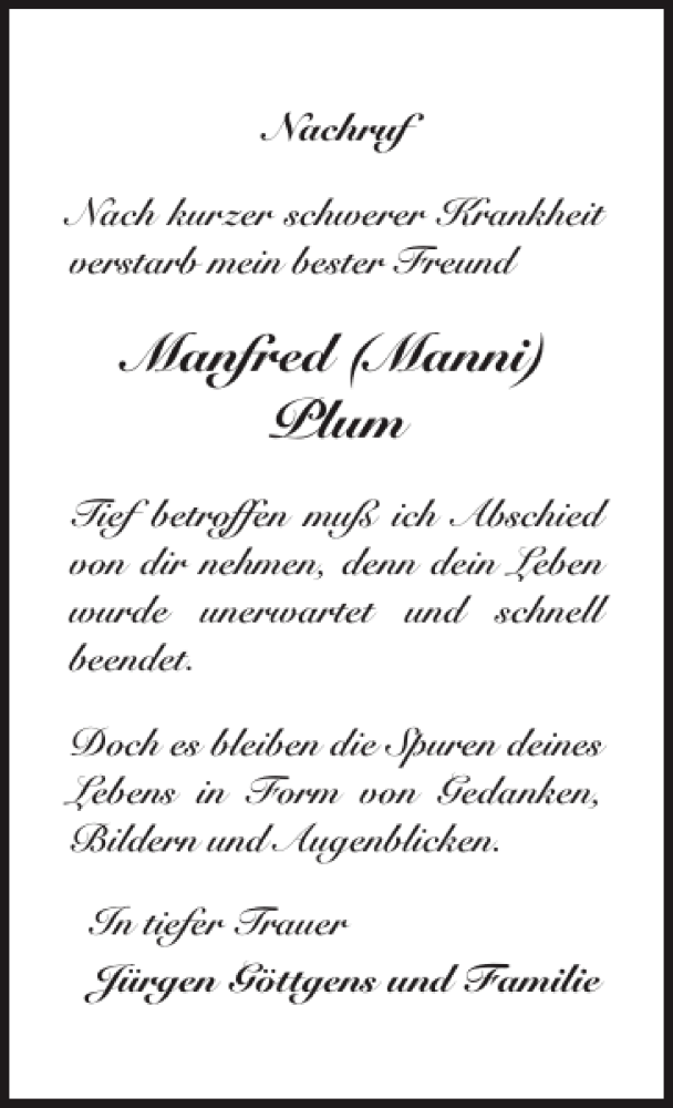 Hier finden Sie alle Traueranzeigen aus der Zeitung, die bisher für Manfred Manni Plum erschienen sind. Weitere Traueranzeigen, die in der Zeitung erscheinen, werden hier ebenfalls aufgelistet