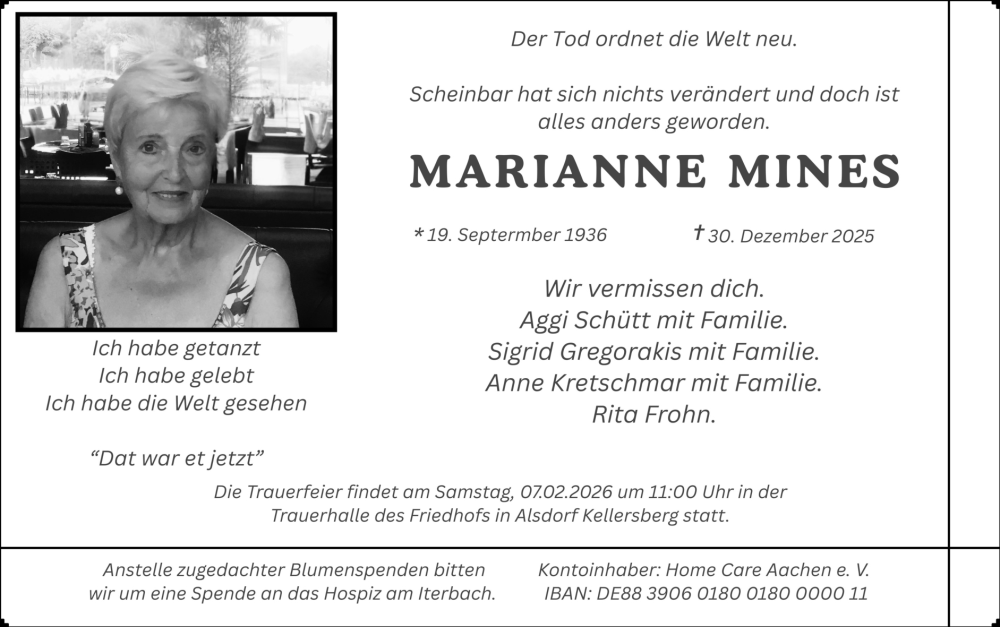 Hier finden Sie alle Traueranzeigen aus der Zeitung, die bisher für Marianne Mines erschienen sind. Weitere Traueranzeigen, die in der Zeitung erscheinen, werden hier ebenfalls aufgelistet