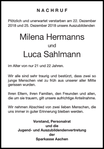 Hier finden Sie alle Traueranzeigen aus der Zeitung, die bisher für Milena Hermanns Luca Sahlmann erschienen sind. Weitere Traueranzeigen, die in der Zeitung erscheinen, werden hier ebenfalls aufgelistet