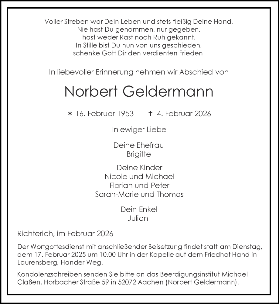 Hier finden Sie alle Traueranzeigen aus der Zeitung, die bisher für Norbert Geldermann erschienen sind. Weitere Traueranzeigen, die in der Zeitung erscheinen, werden hier ebenfalls aufgelistet