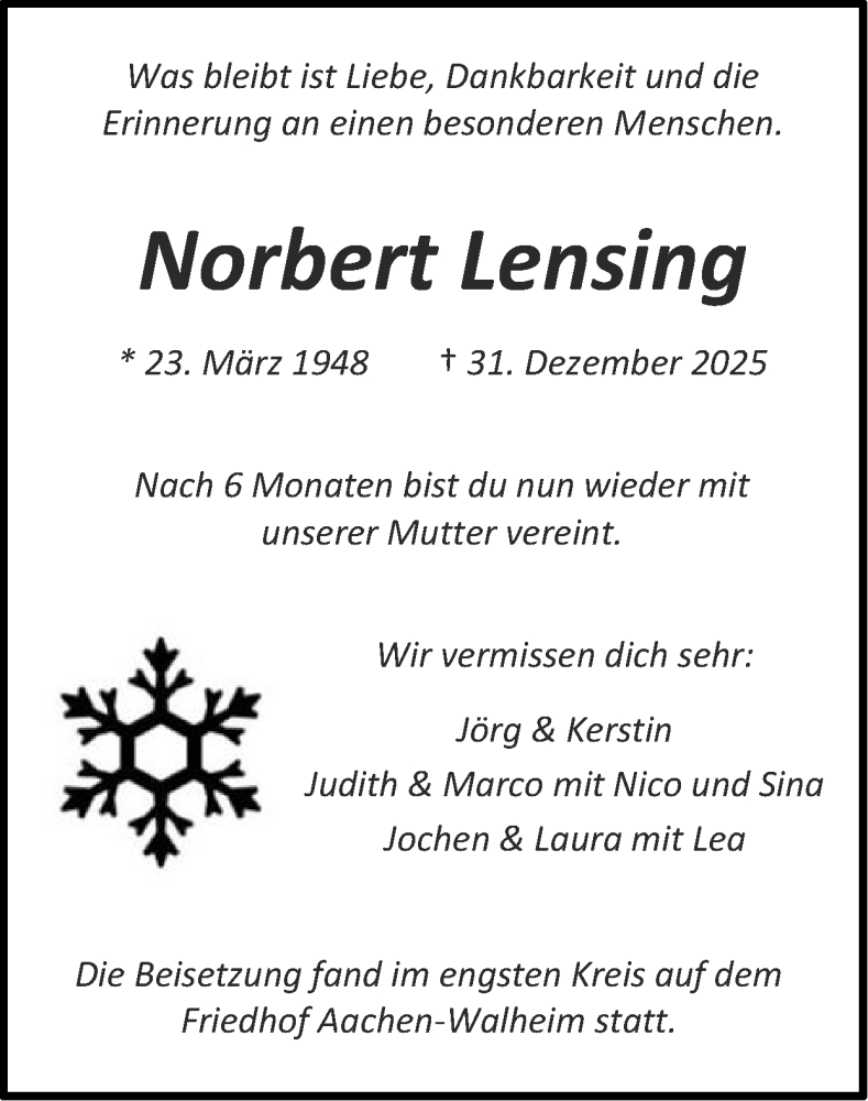 Hier finden Sie alle Traueranzeigen aus der Zeitung, die bisher für Norbert Lensing erschienen sind. Weitere Traueranzeigen, die in der Zeitung erscheinen, werden hier ebenfalls aufgelistet