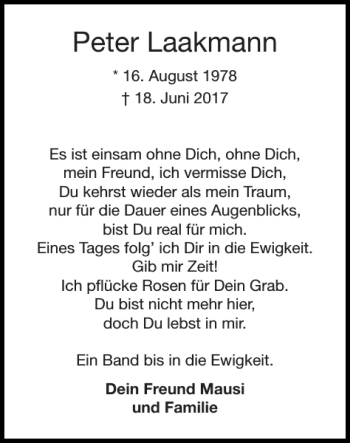 Hier finden Sie alle Traueranzeigen aus der Zeitung, die bisher für Peter Laakmann erschienen sind. Weitere Traueranzeigen, die in der Zeitung erscheinen, werden hier ebenfalls aufgelistet