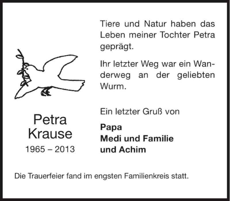 Hier finden Sie alle Traueranzeigen aus der Zeitung, die bisher für Petra Krause erschienen sind. Weitere Traueranzeigen, die in der Zeitung erscheinen, werden hier ebenfalls aufgelistet