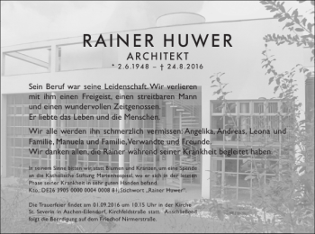 Hier finden Sie alle Traueranzeigen aus der Zeitung, die bisher für RAINER HUWER erschienen sind. Weitere Traueranzeigen, die in der Zeitung erscheinen, werden hier ebenfalls aufgelistet