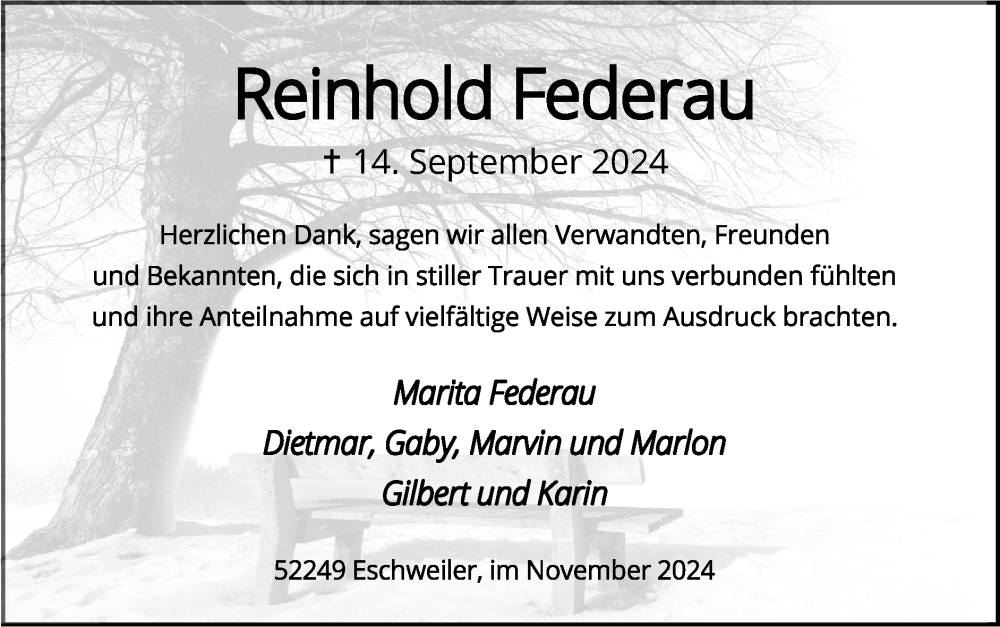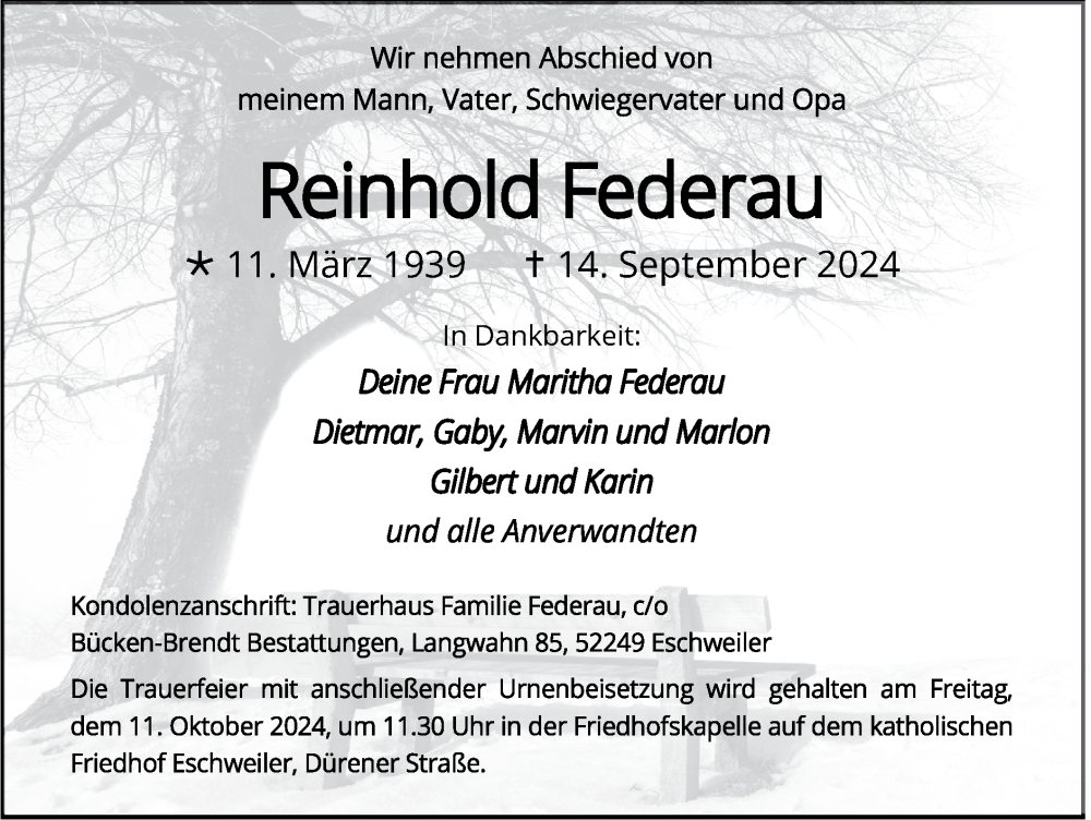 Hier finden Sie alle Traueranzeigen aus der Zeitung, die bisher für Reinhold Federau erschienen sind. Weitere Traueranzeigen, die in der Zeitung erscheinen, werden hier ebenfalls aufgelistet