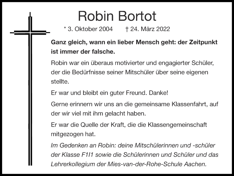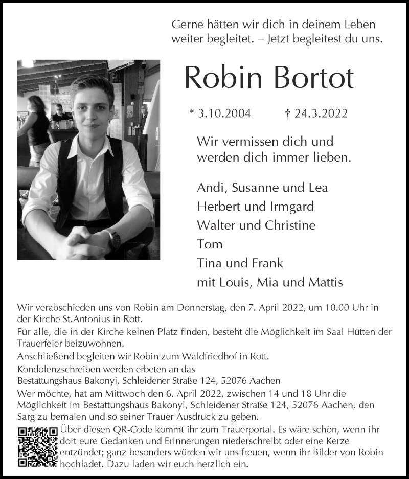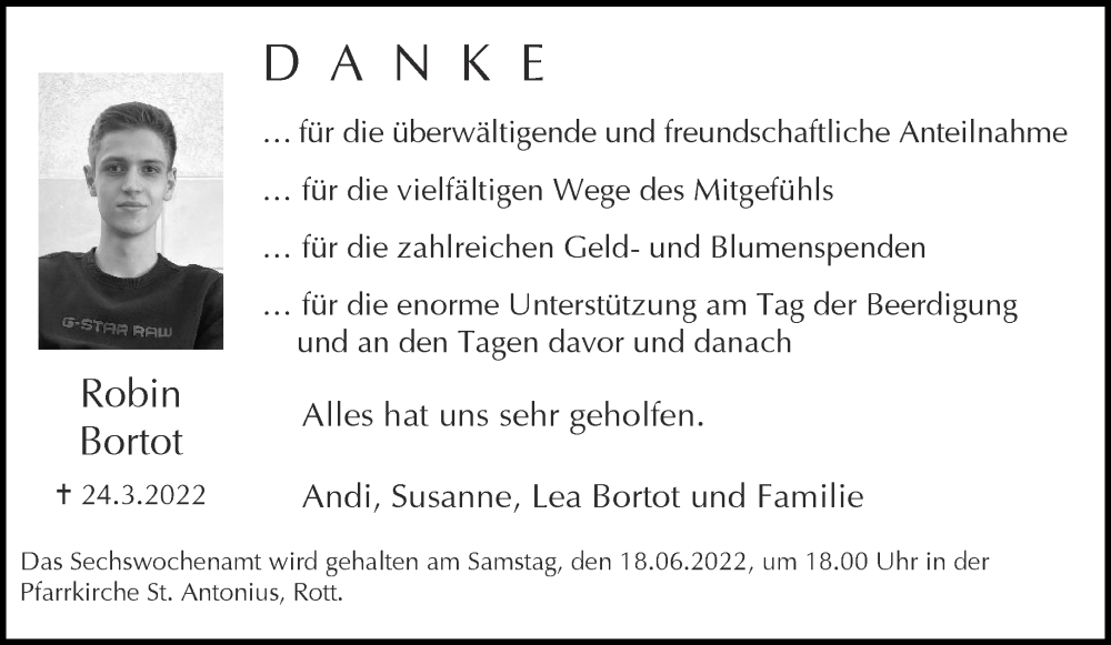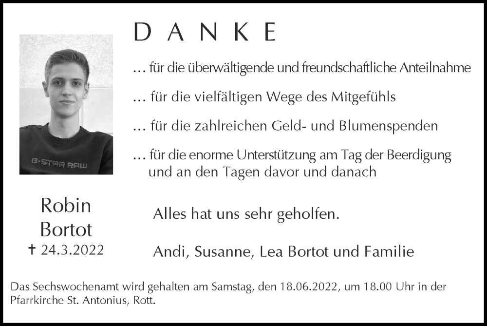 Hier finden Sie alle Traueranzeigen aus der Zeitung, die bisher für Robin Bortot erschienen sind. Weitere Traueranzeigen, die in der Zeitung erscheinen, werden hier ebenfalls aufgelistet