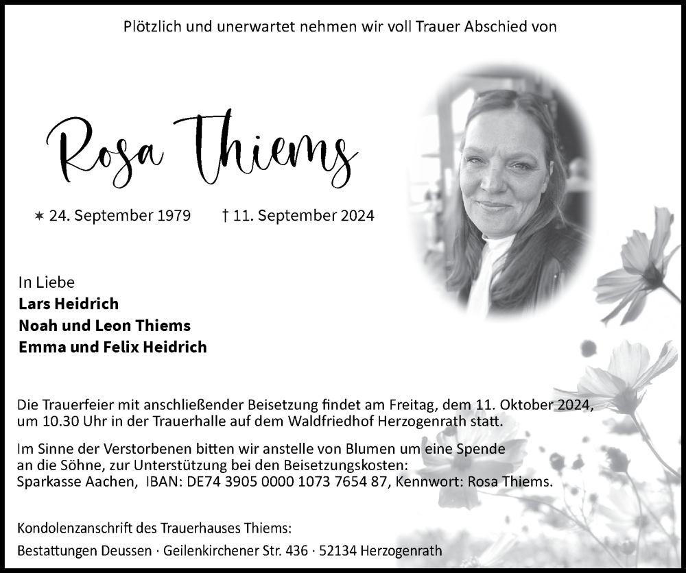 Hier finden Sie alle Traueranzeigen aus der Zeitung, die bisher für Rosa Thiems erschienen sind. Weitere Traueranzeigen, die in der Zeitung erscheinen, werden hier ebenfalls aufgelistet