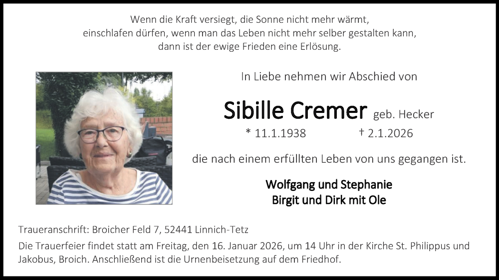 Hier finden Sie alle Traueranzeigen aus der Zeitung, die bisher für Sibille Cremer erschienen sind. Weitere Traueranzeigen, die in der Zeitung erscheinen, werden hier ebenfalls aufgelistet