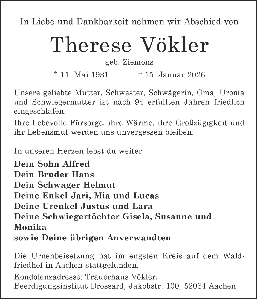 Hier finden Sie alle Traueranzeigen aus der Zeitung, die bisher für Therese Vökler erschienen sind. Weitere Traueranzeigen, die in der Zeitung erscheinen, werden hier ebenfalls aufgelistet