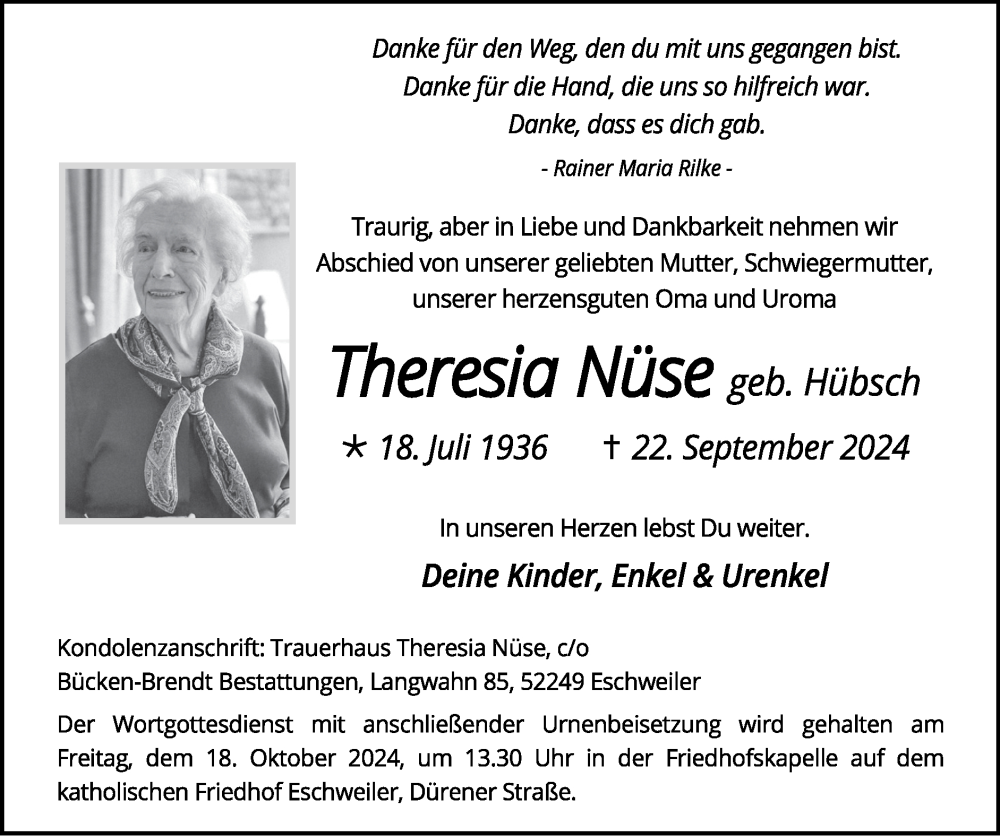 Hier finden Sie alle Traueranzeigen aus der Zeitung, die bisher für Theresia Nüse erschienen sind. Weitere Traueranzeigen, die in der Zeitung erscheinen, werden hier ebenfalls aufgelistet