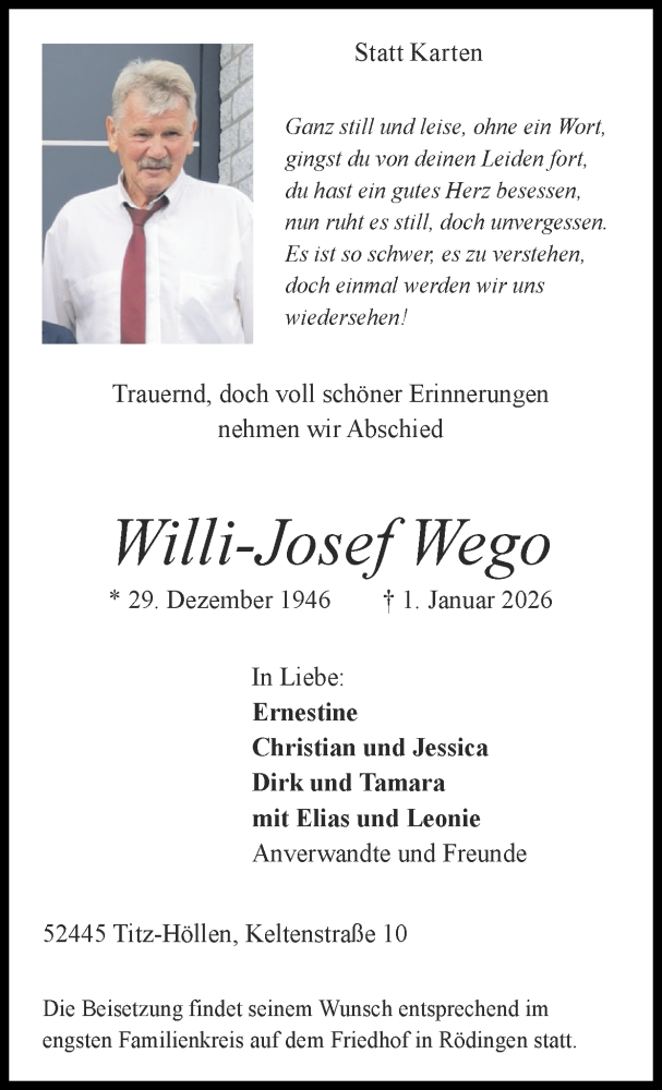 Hier finden Sie alle Traueranzeigen aus der Zeitung, die bisher für Willi-Josef Wego erschienen sind. Weitere Traueranzeigen, die in der Zeitung erscheinen, werden hier ebenfalls aufgelistet