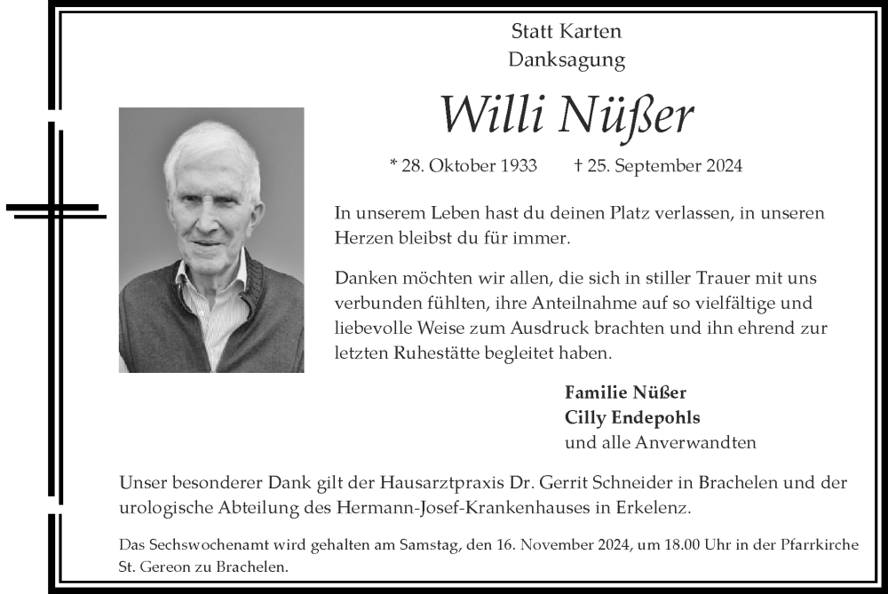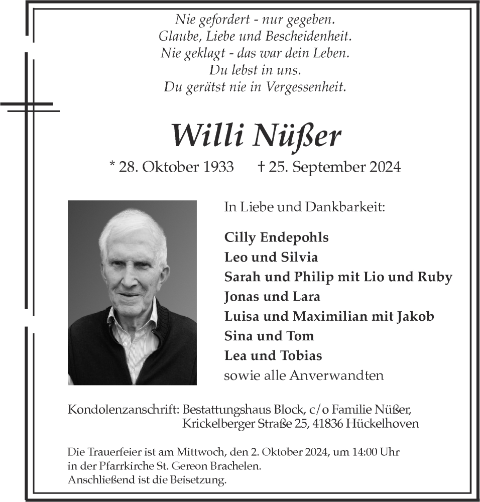 Hier finden Sie alle Traueranzeigen aus der Zeitung, die bisher für Willi Nüßer erschienen sind. Weitere Traueranzeigen, die in der Zeitung erscheinen, werden hier ebenfalls aufgelistet