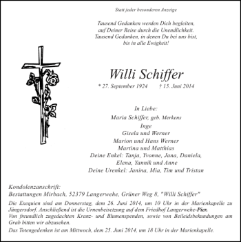 Hier finden Sie alle Traueranzeigen aus der Zeitung, die bisher für Willi Schiffer erschienen sind. Weitere Traueranzeigen, die in der Zeitung erscheinen, werden hier ebenfalls aufgelistet
